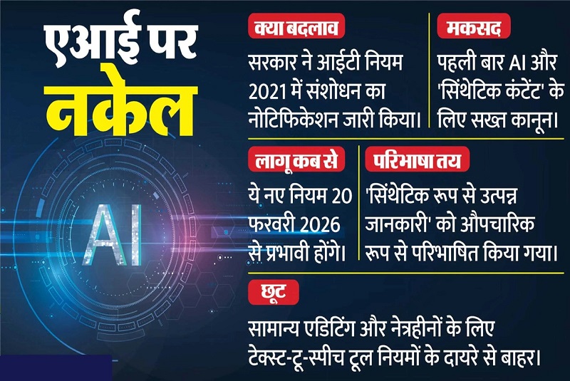 AIContentLabel : AI कंटेंट पर अब देना होगा लेबल ! नियम लागू :- इलेक्ट्रॉनिक्स और सूचना प्रौद्योगिकी मंत्रालय की AI कंटेंट को लेकर आई नई गाइड्लाइन का आज से पालन करना अनिवार्य हो जाएगा. 10 फरवरी को जारी नोटिफिकेशन के मुताबिक, सोशल मीडिया प्लेटफॉर्म्स जैसे यू-ट्यूब, इंस्टाग्राम, स्नैपचैट, ट्विटर और फेसबुक को अपने प्लेटफॉर्म पर शेयर किए जाने वाले AI कंटेंट पर लेबल लगाना होगा. इसके साथ ही अगर कोई डीपफेक वीडियो या फोटो अपलोड होता है, तो उसे 3 घंटे में हटाने होगा. मंत्रालय ने इसके लिए IT रूल्स 2021 में बदलाव किया है।